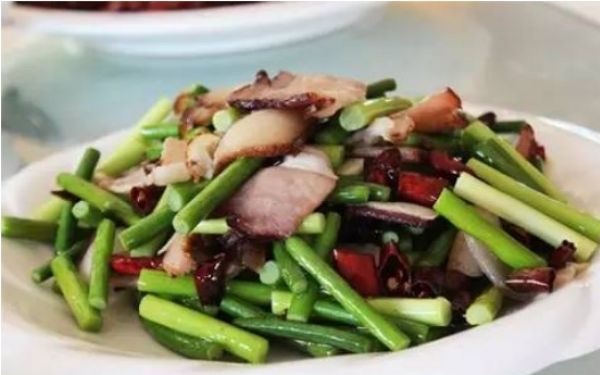 蒜薹带些辛辣的味道和有果木微醺的香气的腊肉堪称绝配,虽是家常小菜却异常美味。
