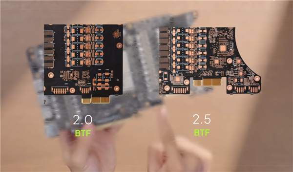 所谓背插2.5,就是在背插2.0的基础上,将显卡底部供电接口上移,通过小小的转接卡连接主板供电母口,同时保留顶部的传统供电接口。