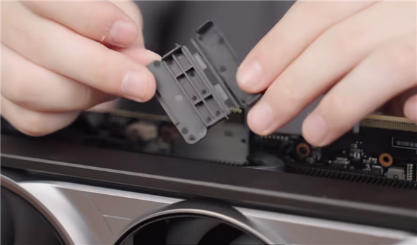 为了避免因为显卡散热器影响,难以拔掉转接卡,华硕还设计了一个小小的辅助工具,两边都有小孔,对准转接卡合起来,就可以轻松将其拿掉。