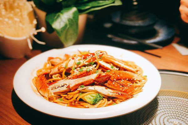 3、走菜时,炒蟹块和烫面条要同时进行,以确保两烫相遇,碰撞出最佳的滋味。