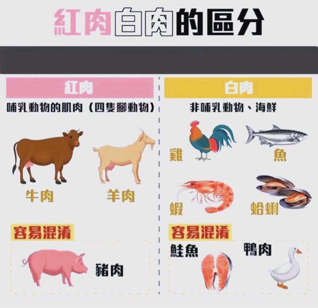 白肉指鸡肉、鱼肉,含蛋白质高,胆固醇及饱和脂肪酸少;红肉指猪肉、牛肉、羊肉,含胆固醇及饱和脂肪酸高,容易形成高脂血症,造成动脉粥样硬化及心脑血管疾病发生。