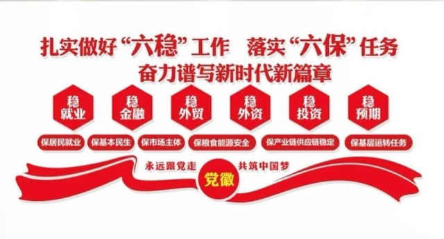 “六稳”指的是:稳就业、稳金融、稳外贸、稳外资、稳投资、稳预期工作。