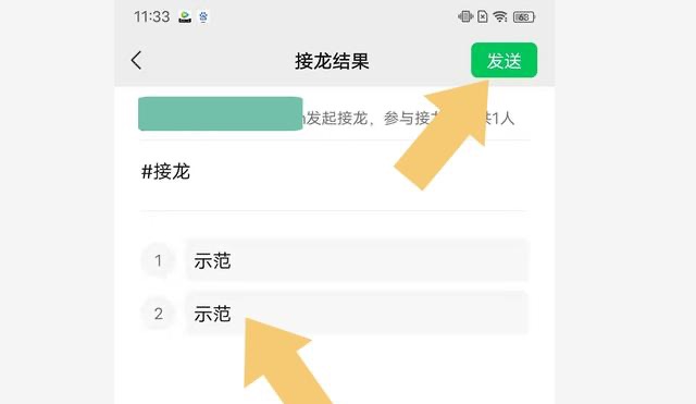 3、在【例】右侧输入框中设置格式,在【1】处填写接龙信息,选择【发送】即可。