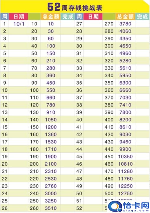 52 周阶梯式存钱法,这个攒钱大法曾经流行全世界的。它是按照等差的方式,每周比上周多存一定数额的钱,比如第1周存10元,第2周 20元,第3周 30元……依此类推,第 52周存 520元。这样一年下来,即使起始金额只需 10元,到年底总额竟然也抵达了13,780元。