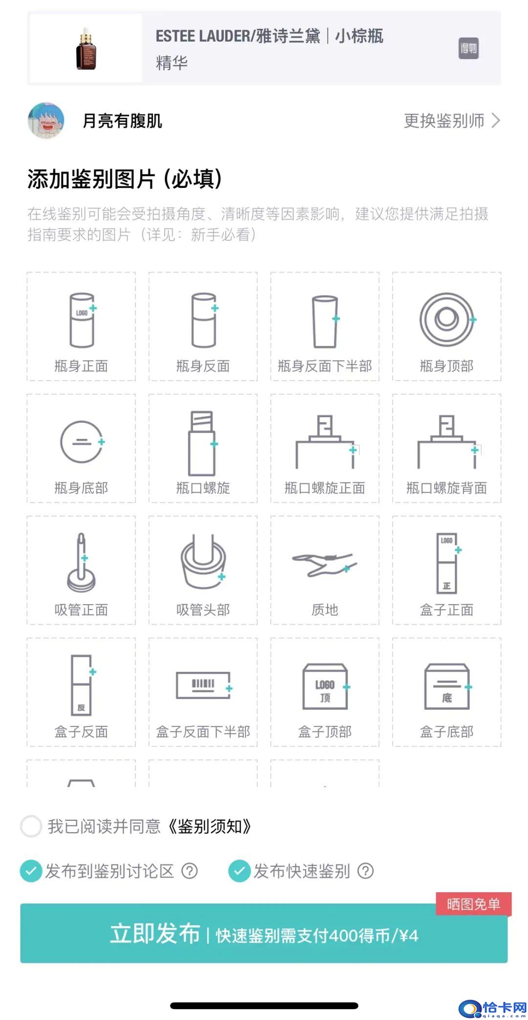 作为时髦潮男的汇集地,得物APP曾凭仗潮牌鞋类产品鉴别火爆一时。近年来,得物逐步将审定业务拓展到美妆范畴,以至搭建起从美妆产品审定到销售的闭环生态链。记者发现,心心、维鉴、识货等APP审定真伪的根据大同小异,均为外包装、瓶身等包材方面的审定。以得物提供的审定雅诗兰黛小棕瓶页面为例,消费者需从瓶身、瓶口、吸管、包装盒等角度提供18张鉴别图片,效劳费为4元。