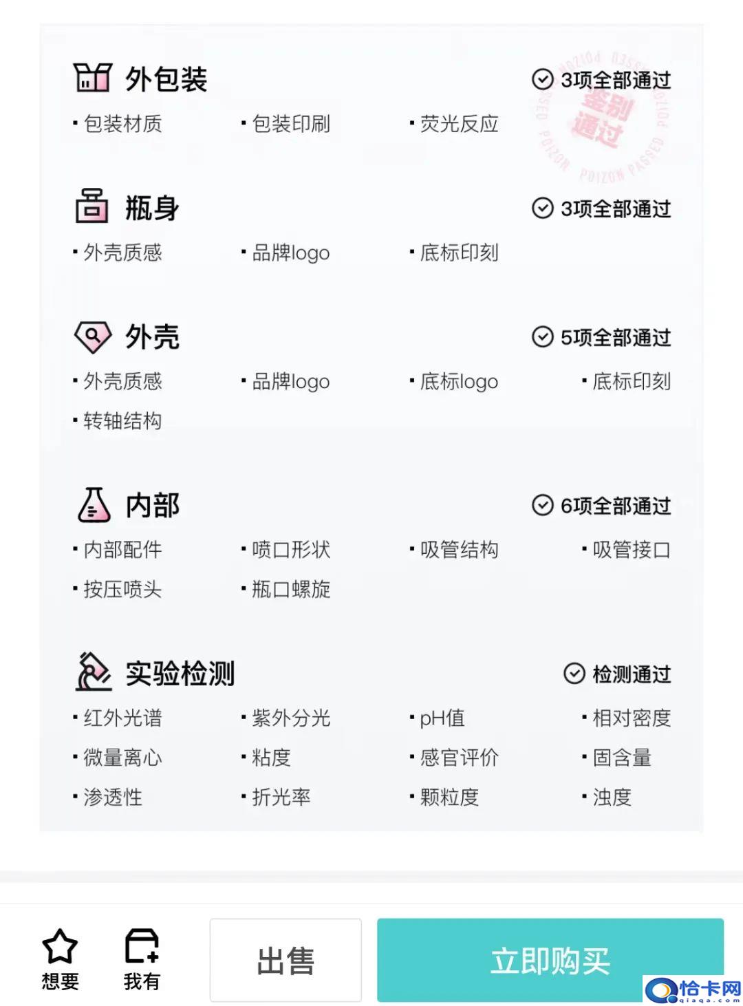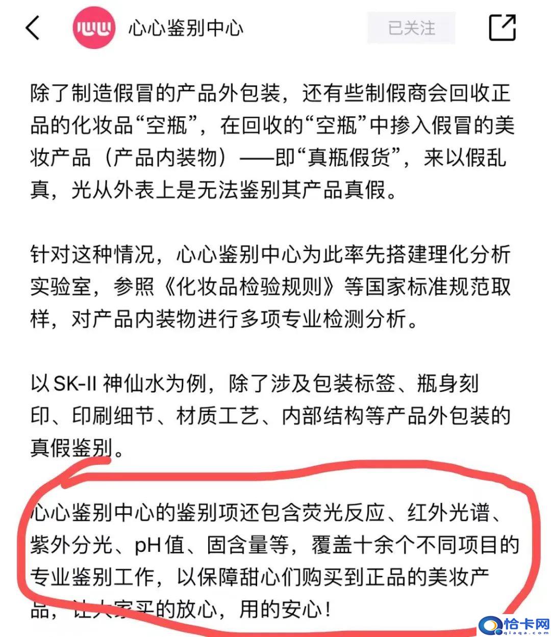 以SK-II 神仙水为例,除了触及包装标签、瓶身刻印、印刷细节、材质工艺、内部构造等产品外包装的真假鉴别,心心App的鉴别项还包含荧光反响、红外光谱、紫外分光、pH值、固含量等。心心App声称已搭建起理化剖析实验室,参照《化装品检验规则》等国度规范标准取样,对产品内装物停止多项专业检测剖析。