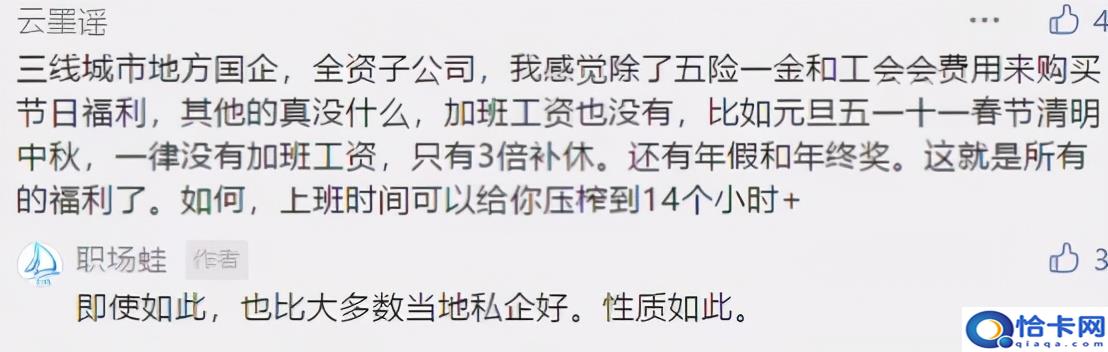 上图这位读者的举例,大约率是某地州市或者小省会城市的市属国企的下属二级、三级子公司,级别不高,收入也难起来。多说一句,“3倍补休”,在民企私企根本是不存在的,1倍曾经算良知了。
