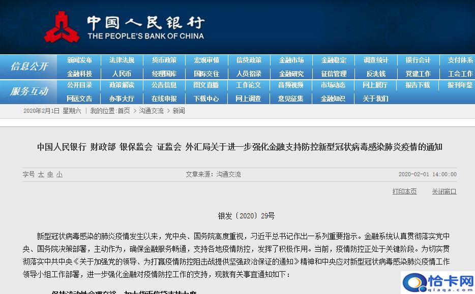 2020年2月,中国人民银行、财政部、银保监会等五部门发布《关于进一步强化金融支持防控新型冠状病毒感染肺炎疫情的通知》。
