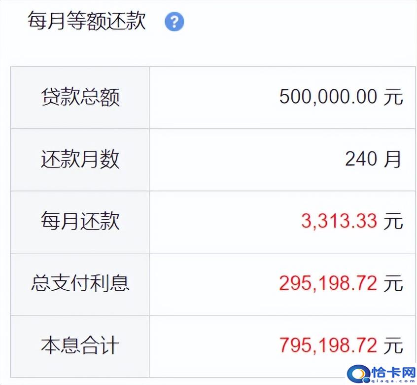 以20年期50万元等额本息房贷为例,从原来基准利率5.94%下浮15%也就是0.85倍执行,房贷利率为5.049%,每月还款3313.33元,利息合计29.5万。