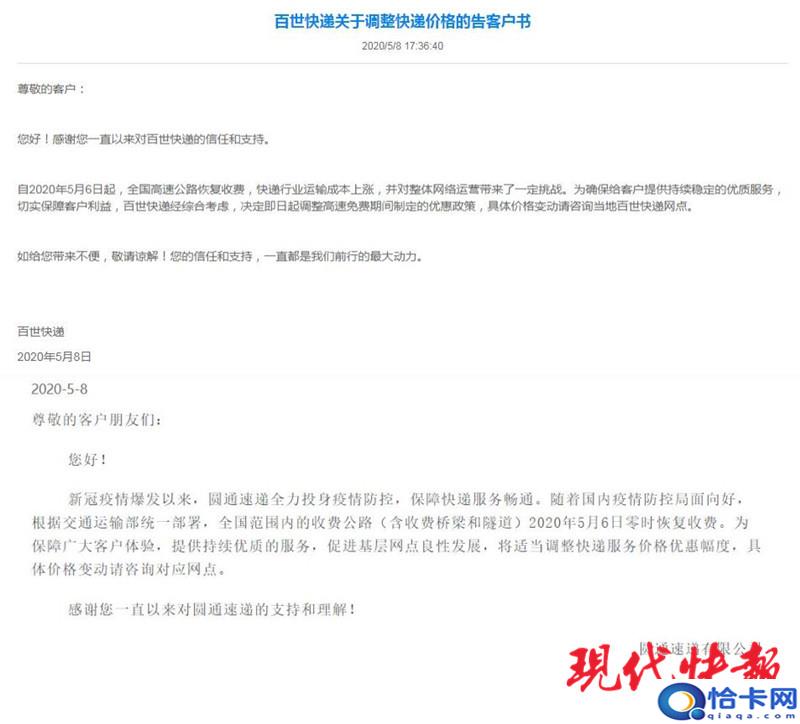 5月8日,申通、圆通、百世等快递公司官宣,因全国范围内的收费公路(含收费桥梁和隧道)于5月6日零时恢复收费,为保证末端网点有序复产、完善客户体验,促进基层网点良性开展,将恰当调整快递效劳价钱优惠幅度,详细价钱变动请咨询对应网点。对此,现代快报记者理解了南京市场,目前局部快递小哥和网点还没有接到通知。业内人士剖析,此价钱变动主要是针对电商大客户,个人散户可能没什么影响。