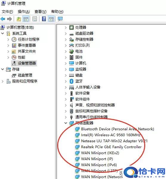经过右键“我的电脑”-“管理”-“设备管理器”-“网络适配器”中查看网卡状态,假如此时找不到网络适配器,则可能会呈现两种状况。