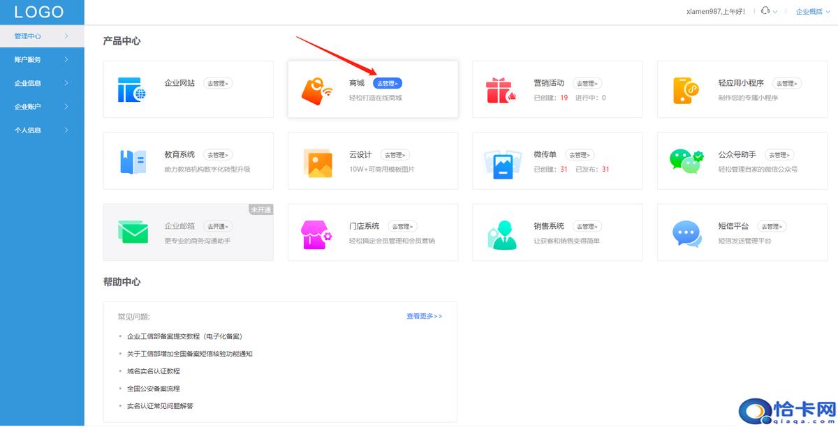 先登录乔拓云平台进入后台,找到【商城】模块点击其中的【去管理】进入商城的后台管理页面。