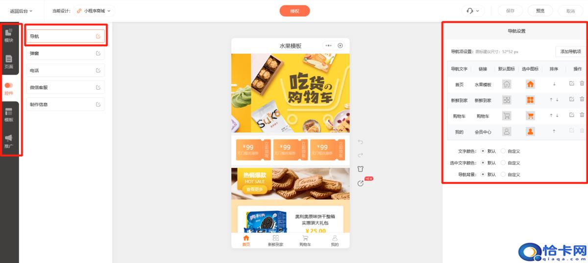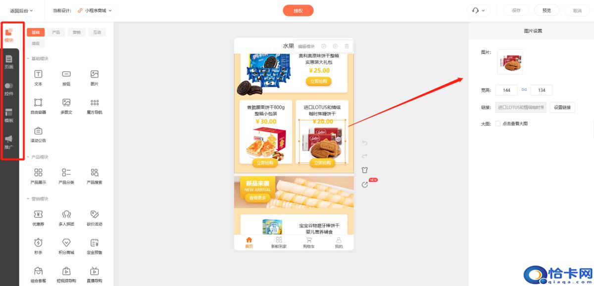 选好模板后,便可对其停止编辑修正。能够直接点击模板页面中要修正的内容停止编辑,也能够点击左边的选项停止修正设置,比方点击【模块】选项可添加其他的功用到页面中,比方产品展现、优惠券、砍价活动、定金预售、直播导购、多商户等功用;点击【控件】选项可针对页面中的各个小控件停止设置,比方导航、电话、微信客服等;点击【推行】选项可针对小程序商城的推行方式停止设置。