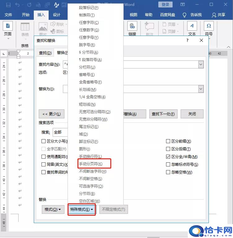 首先按「Ctrl+H」键直接打开查找替换的窗口,在「特殊格式」中选择「手动分页符」,最后点击「全部替换」,就可以一下子把所有空白页都删除了!