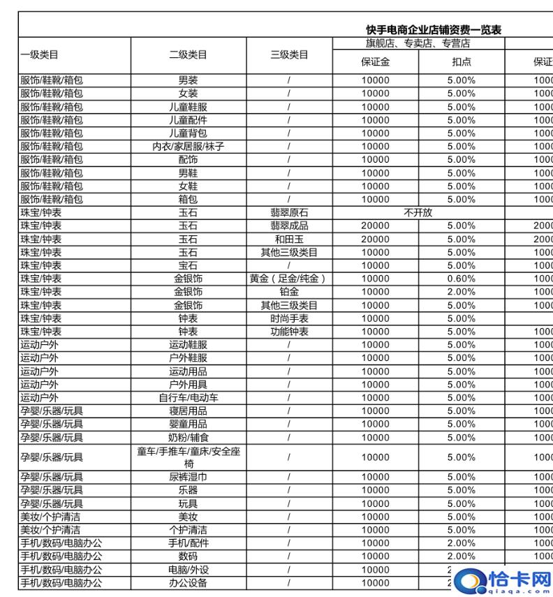 快手部分品类资费标准图