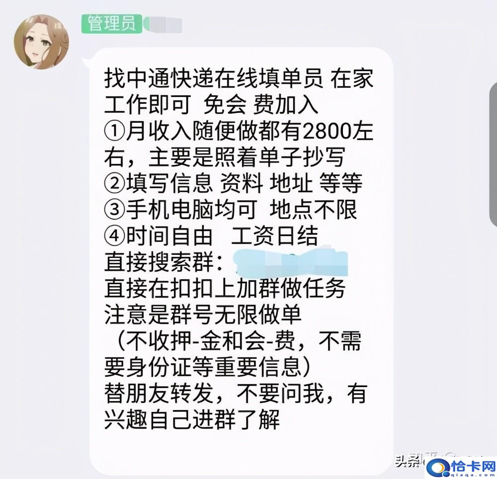 家住市区水木华园小区的杨女士是全职太太,每日将孩子送到学校后,便觉得无事可做,便想着在网上干个兼职贴补家用。找了一圈后,她觉得“时间和工作地点自由”这一点很难符合。前段时间,她在一个QQ群里看到有人发布“招聘快递单录入员”的信息,“工作简单,月收入可达万元,无需押金、在家工作、时间不限、手机电脑操作即可……”非常适合她这样的情况,但她又觉得这样的“好事”发生的概率较低,怀疑是虚假广告,看一眼就过去了。可随后,她又不断从其他多个QQ群和微信群看到类似的“招聘信息”,“如果是骗子,怎么会有那么多人发,还有人说自己试着做过了,感觉不错,会不会有些招聘是真的呢?”杨女士有些动摇了,但她记得去寄快递的时候,都是自己用手机扫码下单,单号立即就出来了,难道事后还要手动录入?