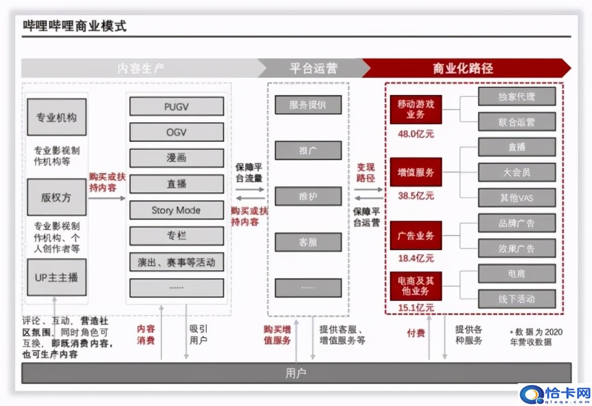 UP主是哔哩哔哩内容的根本生产力,UP主制作内容、内容吸引用户、部分用户进一步转化为UP主,这个独特的生态闭环使Bilibili内容成本大大低于可比公司爱奇艺,它2020年购买内容支出为18.7亿元,爱奇艺208.9亿元,内容成本在收入占比分别为15.6%和70.03%。