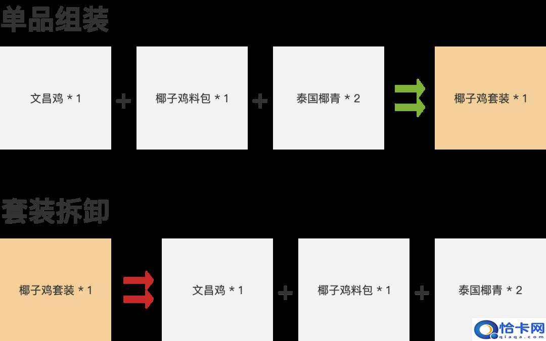 例如我们在一些生鲜超市或者生鲜App上看到的一些套装,这些套装会用保鲜膜缠在一起,然后贴上套装产品的SKU条码。消费者购买的时候,是按整套直接出售的,扣除库存的时候也是直接扣除套装产品的库存。