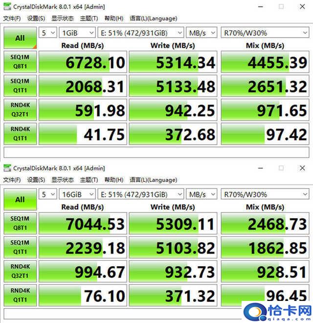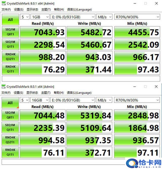 说了这么多,其实要表达的是,看似“安静”的固态硬盘其实一直在“悄悄”进行大量运算,盘内已有的数据越多,对硬盘速度的负面影响就越大,这是无法避免的。根据实测的数据,aigoP7000在半盘状态下1GB的读写测试中,SeqQ8T1读取速度为6728.10MB/s,写入速度为5314.34MB/s,16GB的读写测试中,SeqQ8T1读取速度为7044.53MB/s,写入速度为5309.11MB/s,并没有出现半盘严重掉速的情况,说明长时间使用依然能保持优秀的速度,作为存放大型数据的游戏仓库盘是再适合不过了。