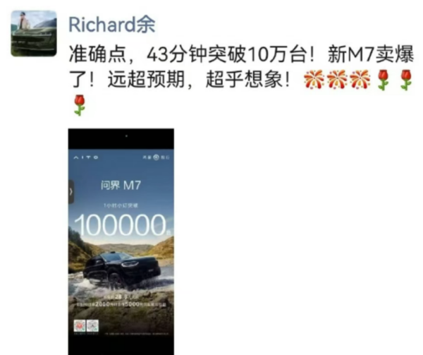 9月5日上午10点08分,全新问界M7公布预售价并同步开启预订,预售价28.8万元起,提供了增程和纯电两种版本。余承东第一时间发朋友圈称:“10分钟内订单突破两万台,43分钟便突破10万台大关。”