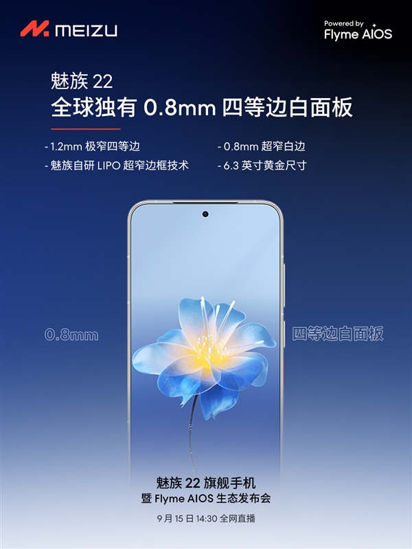 据悉,魅族22做到了1.2mm极窄四等边,拥有0.8mm超窄白边,搭载魅族自研LIPO超窄边框工艺,配合6.3英寸黄金尺寸,握感舒适。