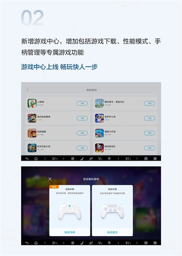 同时,新车机上线游戏中心,提供JJ麻将、模拟城市:我是市长、迷你枪战精英等多款游戏下载,支持性能模式与手柄管理,开启手柄后可自动配对或前往蓝牙完成连接,满足驾乘者娱乐需求。