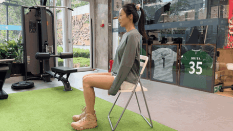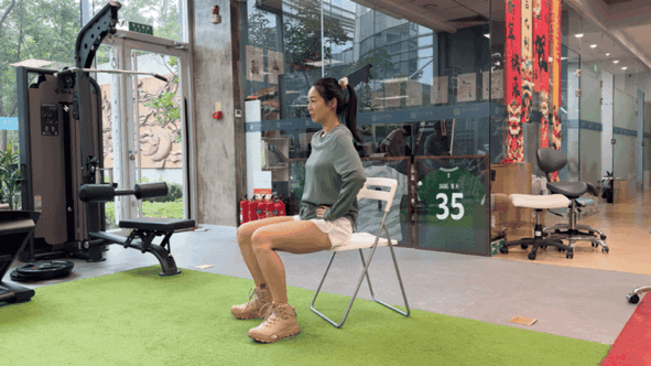 坐在椅子边缘,双脚与肩同宽,身体稍前倾,用腿部力量站起,然后缓慢坐下。控制下落过程。每组 8-12 次,完成 2-3 组。[5]