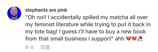 “哦不!我不小心弄洒了我的抹茶,抹茶不小心溅到了我的女权主义书籍上。”