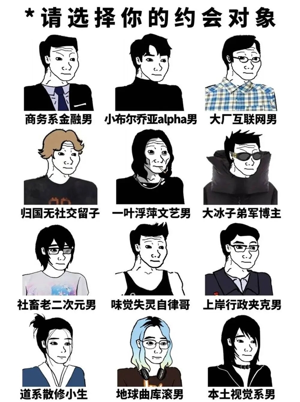 毕竟在我们的婚恋市场,主力人群仍然是热衷讨论国际军事的大肚子男,左手啤酒右手利群。其余人群平均分布在商务金融男、张江高科大厂男、劳务派遣冒充厅局级男、古风小生封建男之间。