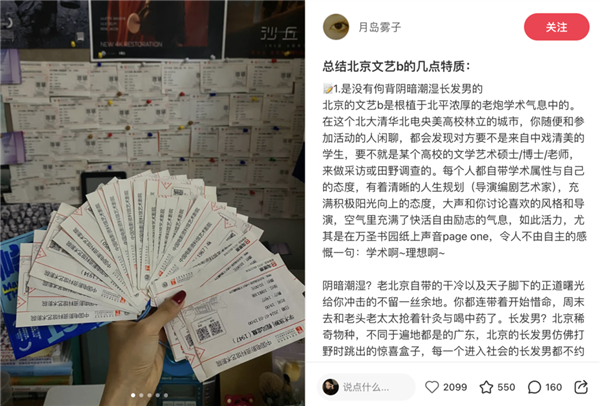 衣品吊打大多数男性,身穿国内正确版本的uma wang;肩膀上挂着各种电影节的周边帆布包;香水喷的必须是Le Labo 33号的木质香。