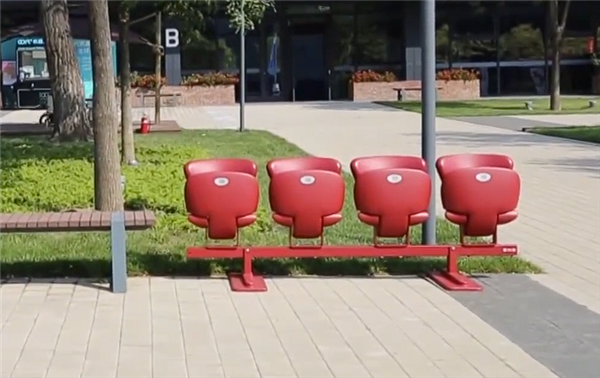 红色座椅与首钢工业遗产特有的“铁锈红”色调相呼应,从天安门到首钢园,实现了跨场景高效复用,形成历史与现代的视觉融合。