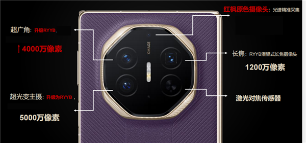 超广角和主摄都升级成了 RYYB 传感器,与之对应的三折叠机型也终于用上了红枫原色摄像头。至此华为从 Pura 系列到 Mate 系列、从直板机到三折叠,所有旗舰机型都用上了红枫影像。
