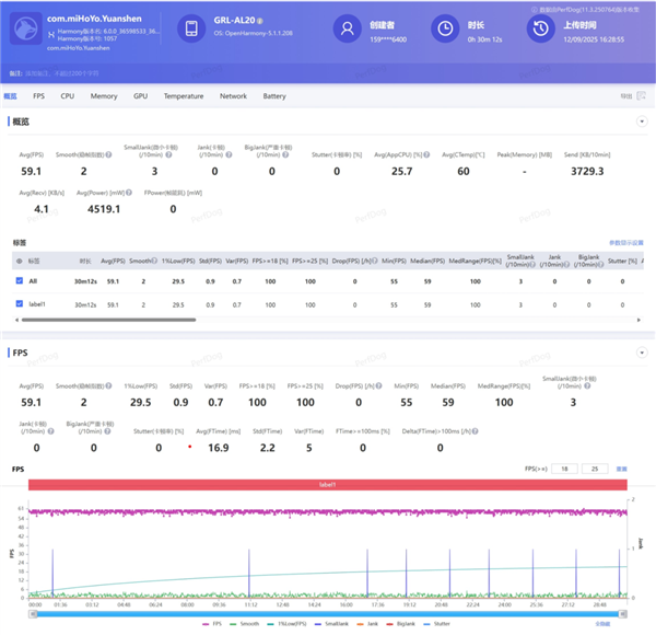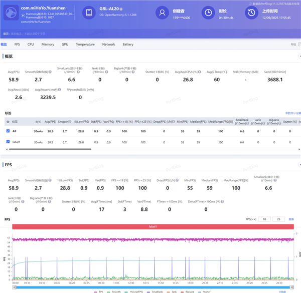 可以看到在 30 分钟须弥城跑图测试,Mate XTs 能在 1488p 的画质下也能跑出稳定的60帧的成绩。