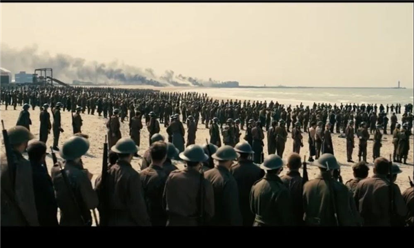 像在《敦刻尔克》里,诺兰就经常把前景的士兵放在画面下方,而将天空与硝烟置于画面上缘。这种构图除了在观众眼前营造出强烈的的纵深感和空间压迫感,也对放映质量提出了最高的要求。