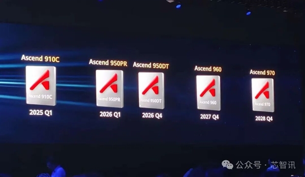 根据路线图显示,华为在今年一季度已经推出了昇腾910C。后续将在2026年第一季度推出全新的昇腾950PR芯片,四季度推出昇腾950DT。2027年四季度,华为将推出昇腾960芯片,2028年四季度推出昇腾970芯片。