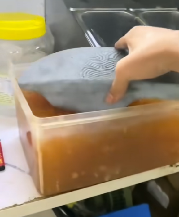 让人意外的是,视频拍摄者直接脱下自己的拖鞋,放入装珍珠的小料盆中蘸了两下,接着用手在小料盆中涮了涮,便徒手捞起珍珠逐一挤入奶茶杯中。