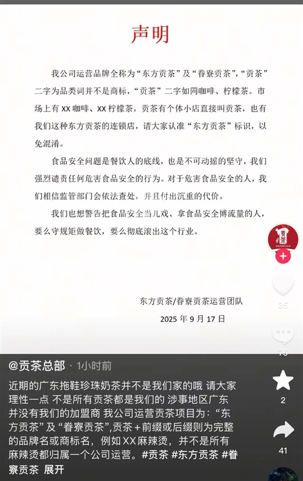 其称近期流传的 “广东拖鞋珍珠奶茶” 事件涉事店铺并非其旗下加盟店,强调涉事地区广东并没有其加盟商,公司运营的贡茶项目为 “东方贡茶” 及 “眷寮贡茶” ,“贡茶 + 前缀或后缀” 才是完整的品牌名或商标名。