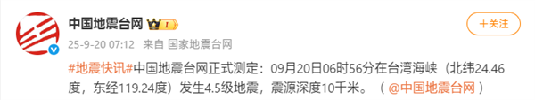 09月20日06时56分在台湾海峡(北纬24.46度,东经119.24度)发生4.5级地震,震源深度10千米。