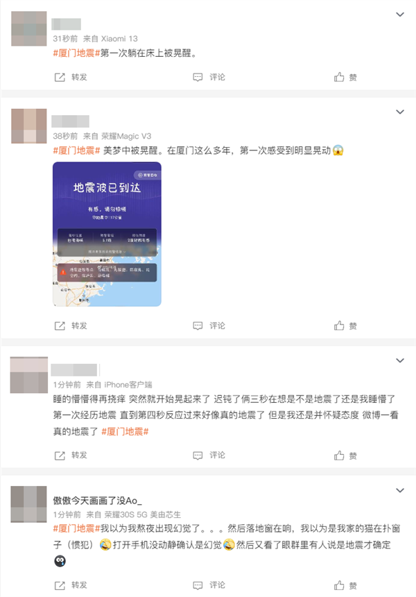 根据网友反馈来看,大量福建厦门、泉州、莆田等地感受到清晰震感,甚至直接摇醒,整个床都在晃动。