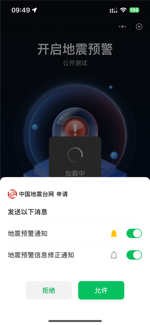 在微信搜索并打开“中国地震台网”小程序,点击开启地震预警,选择允许“地震预警通知”与“获取位置”,成功添加关注地即可开启地震预警,开启仅需3步,关键时刻能救命,