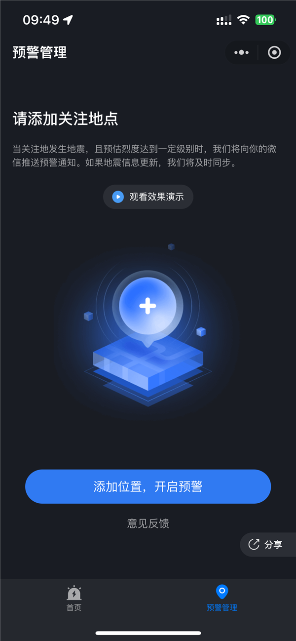 另外,该小程序允许用户设置不同关注地,用户可以添加亲属所在地、旅游目的地等作为第二个关注地,小程序根据关注地实际情况推送地震预警信息。