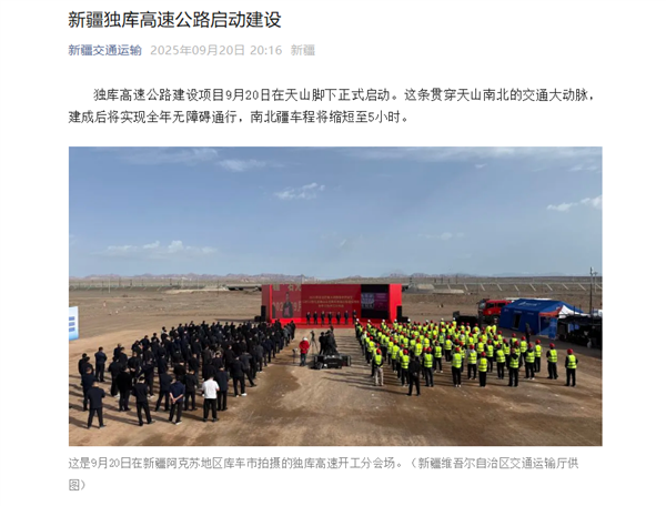 9月21日消息,据“新疆交通运输”公众号公告,昨日,被誉为“天山第二通道”的独库高速公路建设项目正式破土动工。