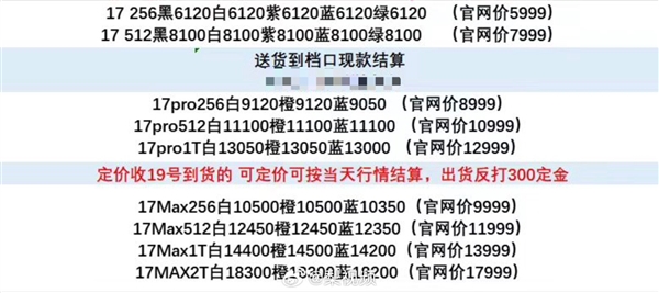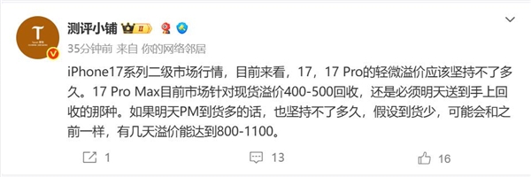 博主测评小铺指出,目前来看iPhone 17、iPhone 17 Pro的轻微溢价坚持不了多久,iPhone 17 Pro Max现货溢价400-500元,必须是明天送到手上的那种。如果到货少,iPhone 17 Pro Max溢价幅度会加大。