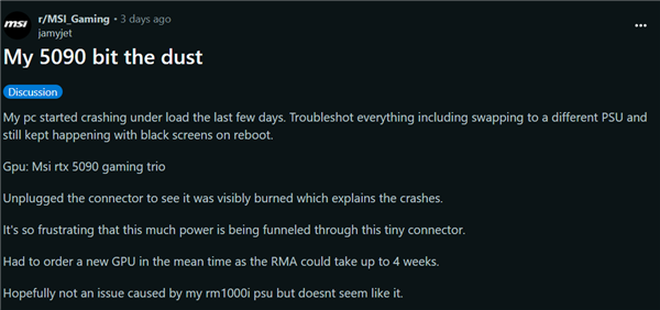 另一位网友“Jamyjet”也报告了一起RTX 5090供电接口烧毁事件,是微星的RTX 5090 GAMING TRIO。