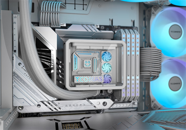该水冷最大的特色在于冷头部分被设计成当下DIY市场中广受欢迎的“海景房”主机造型。尽管体积小巧,但内部结构细致还原了主板、内存、显卡、水冷及机箱风扇等组件,通电后更可点亮ARGB灯效,呈现出精致逼真的迷你主机景观。
