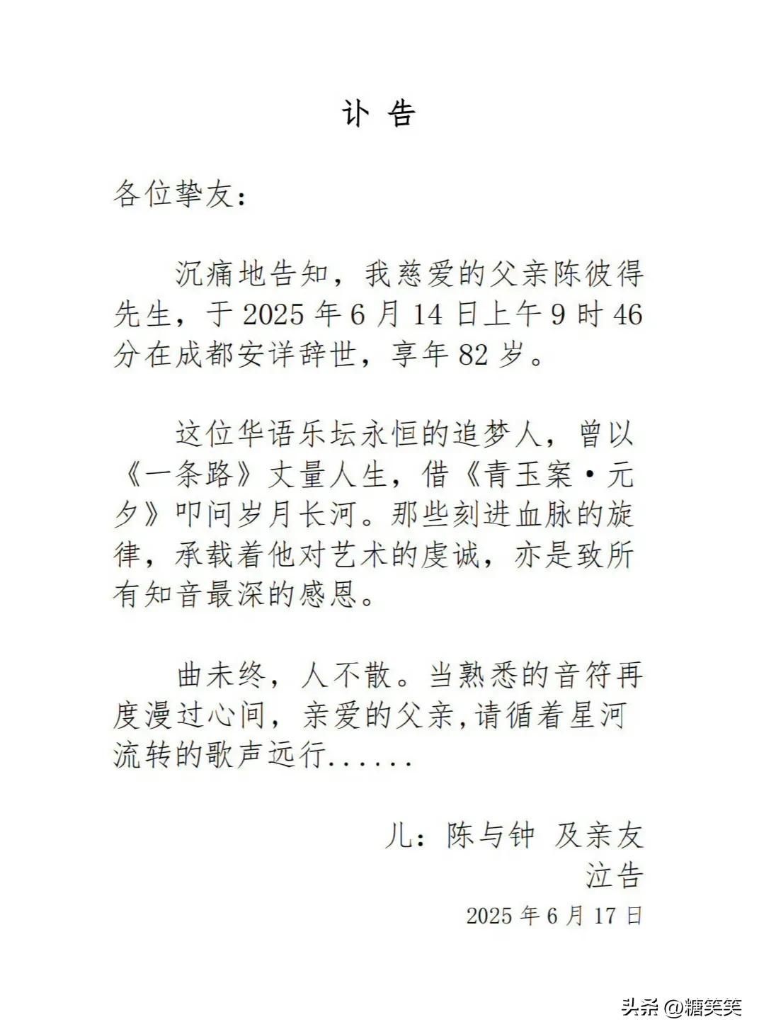 6月17日,一则讣告震动华语乐坛——台湾知名歌手陈彼得的儿子发布消息,陈彼得于6月14日上午溘然长逝,享年82岁 。“曲未终,人不散。当熟悉的音符再度漫过心间,亲爱的父亲,请循着星河流转的歌声远行......”这深情的话语,满是家人的不舍与追思。