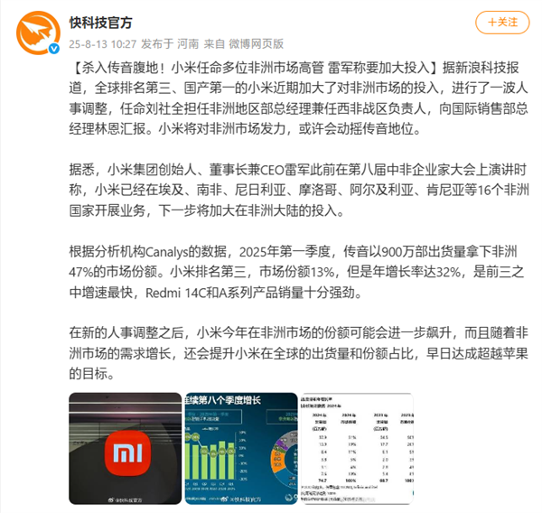 小米目前非常看重非洲市场,小米米集团创始人、董事长兼CEO雷军此前在第八届中非企业家大会上演讲时称,小米已经在埃及、南非、尼日利亚、摩洛哥、阿尔及利亚、肯尼亚等16个非洲国家开展业务,下一步将加大在非洲大陆的投入。