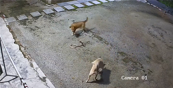 从监控画面看,此事发生在本月20日0点13分,当时院子里有两只狗,一只是黄的,一只是白的,目测都是中华田园犬,它们正在和一条溜进院里的眼镜蛇对峙。