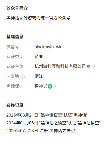 此次更名后,账号认证名称从“黑神话悟空”简化为“黑神话”,标志性的“悟空”二字正式从公众号名称中消失。