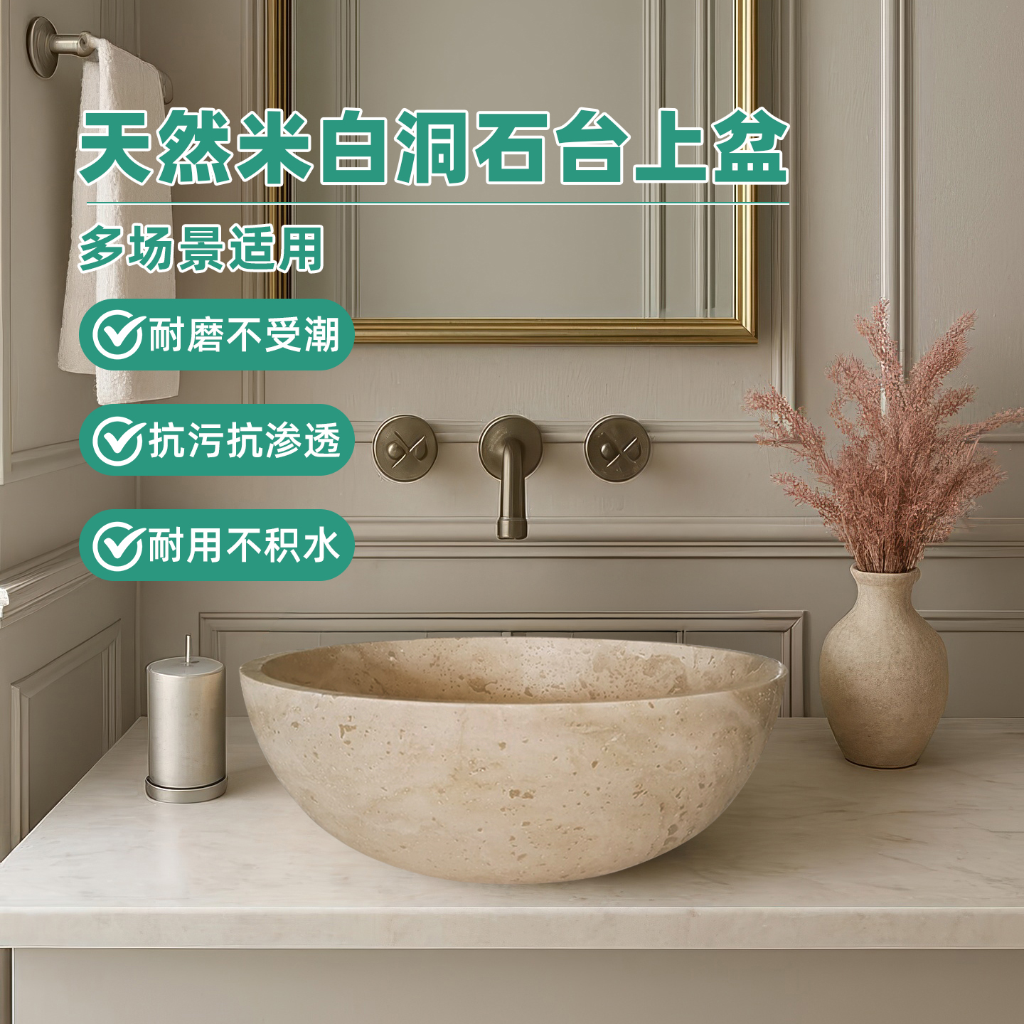 想要将这款侘寂风台上盆洗手盆完美融入你的卫生间,你需要考虑整体的空间风格和色彩搭配。建议选择简洁明快的色调,如白色或淡灰色,这样可以更好地衬托洞石的自然美。